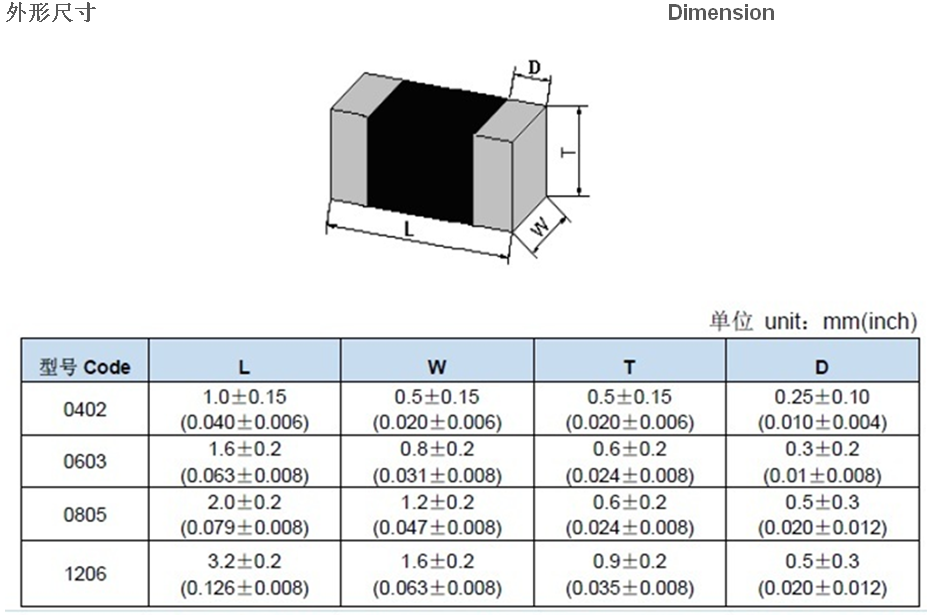 尺寸规格:0402(1005)、0603(1608)、0805(2012);