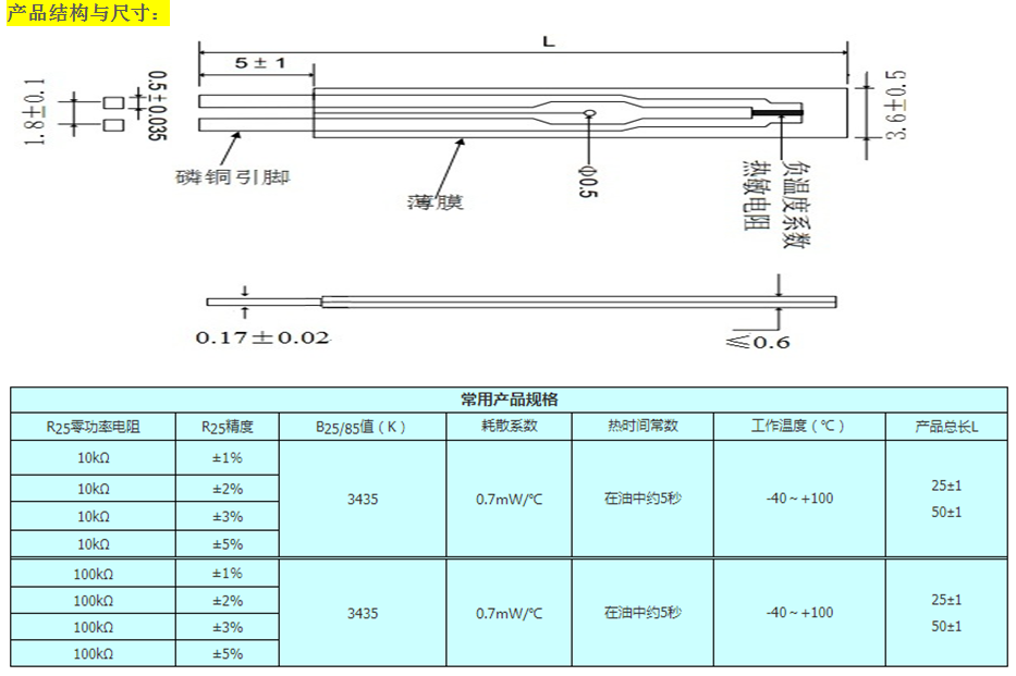 R25范围:1.0×102Ω-6.8×105Ω,电阻值误差级别有±1%、±3%、±5%、±10%;B25/50值范围:2500K-5000K,B值误差级
