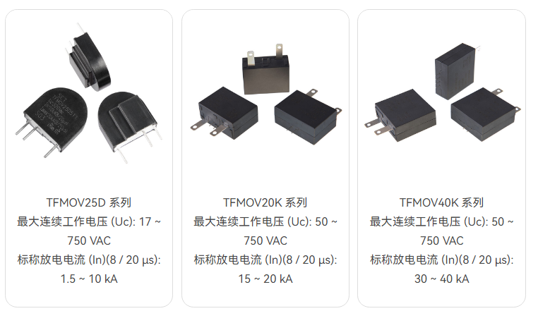 热保护型压敏电阻(TFMOV)是压敏电阻与热保护脱离部件的组合。压敏电阻存在老化特性,热保护型压敏电阻能够在压敏电阻(MOV)劣化或失效时,通过热保护部件的动作将压敏电阻从主回路中脱离。常用于光伏逆变器,通信设备,机房电源等对可靠性和耐候性要求高的场所。