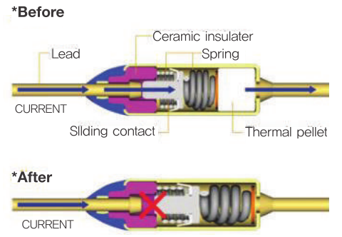 SWC温度保险丝是温度感应回路切断装置,能感应电器电子产品非正常运作中产生的过热,从而切断回路以避免火灾的发生。温度保险丝运作后无法再次使用,只能在熔断温度下动作一次。