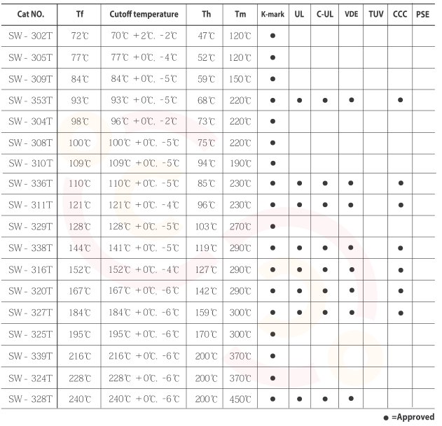 型号有:SW-302T 72℃, SW-305T 77℃,SW-309T 84℃,SW-353T 93℃,SW-304T 98℃,SW-308T 100℃,SW-310T 109℃,SW-336T 110℃,SW-311T 121℃,SW-329T 128℃,SW-338T 144℃,SW-316T 152℃,SW-320T 167℃,SW-327T 184℃,SW-325T 195℃,SW-339T 216℃,SW-324T 228℃,SW-328T 240℃.