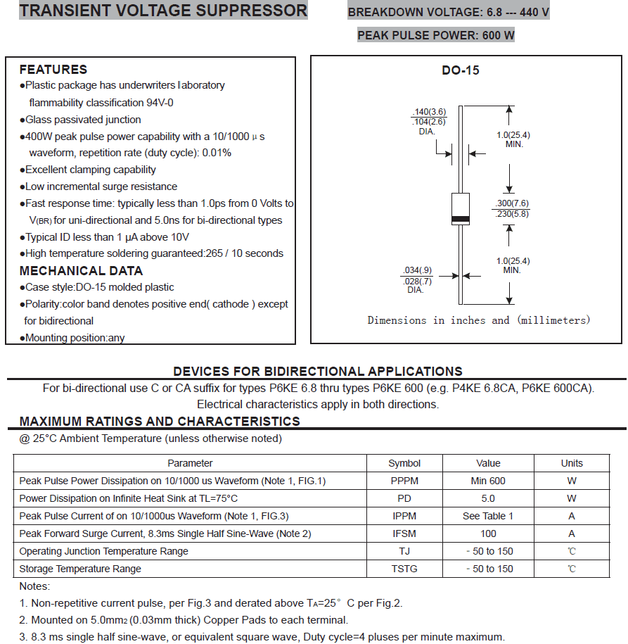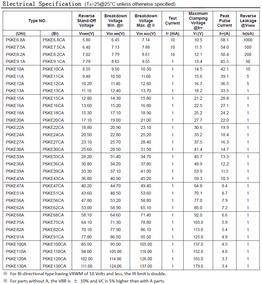 EIDOLL sales the TVS diode ,P6KE series, the specification as below: