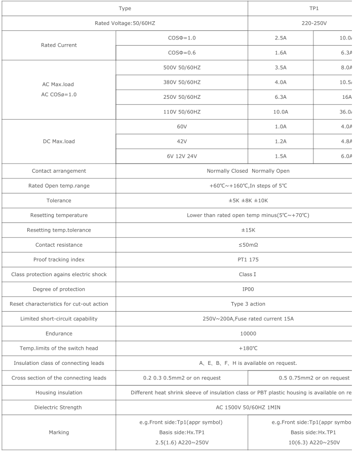 The TP1 series of thermal protector is designed to install inside a motor or on a motor, to prevent the motor from overheat when running or start to malfunction cause by overheating of the automatic controller. The controller bearing motor, motor temperature, current sensitive, or only sensitive to temperature. Therefore the protector can also be used as a thermal cut-off device, use in household, and similar electrical appliances product to prevent overheating on the electrical equipment, avoid the occurrence of safety accidents.