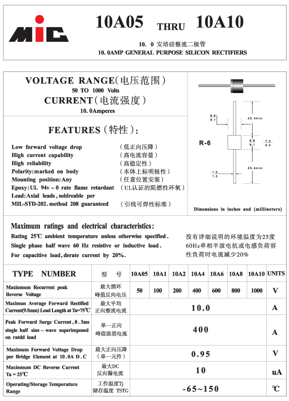 Eidoll Electronics Co., Ltd sales MIC's diode, such as :10A05,10A1£¬10A2£¬10A4£¬10A6£¬10A8£¬10A10,the specification as below: